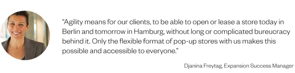This is similar to the communication between landlord and tenant, the conclusion of tenancy agreements and the payment processes that are digitized via our online platform. Go—PopUp provides landlords, owners and property managers with smart online tools for the management of their spaces, or manages them on request, from inquiry management to the entry and exit of short-term tenants for pop-up stores. Our partners in the real estate sector include well-known companies and groups such as CBRE, Engel & Völkers or Unibail Rodamco, who let us rent their commercial spaces for interim and short-term leases and use our know-how for pop-up stores.