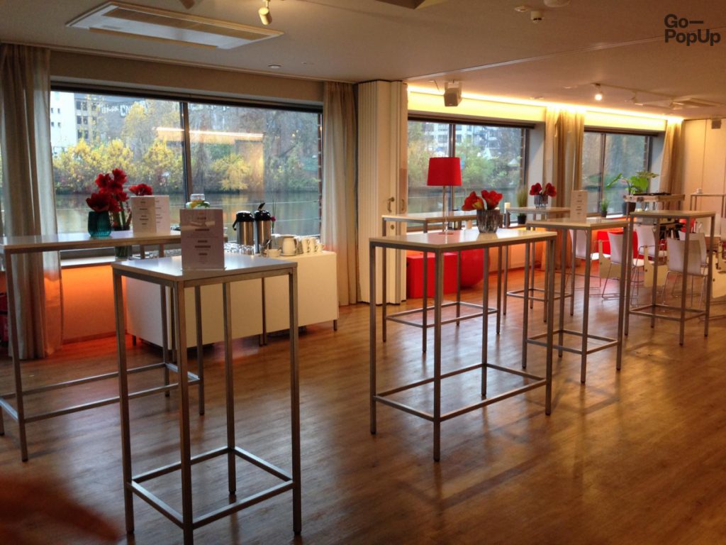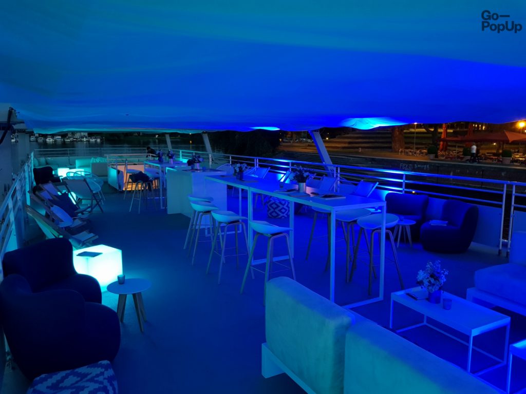 CO2 neutral, emission-free, modern design: here’s your floating location for up to 250 persons with a home port, the most amazing solution to pop-up in Berlin. You can use it not only for marketing goals, but also for any kind of shooting or production. Enjoy the high quality technology on board, the equipped kitchen with a bar and a spectacular rooftop terrace convertible into a heated pavilion in winter. Check it out here.