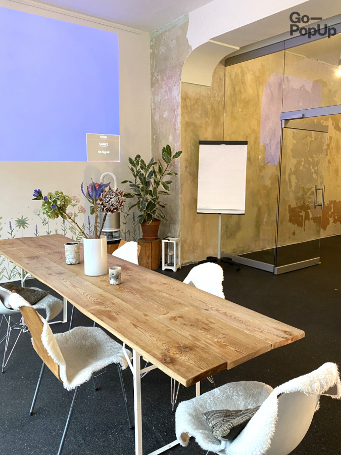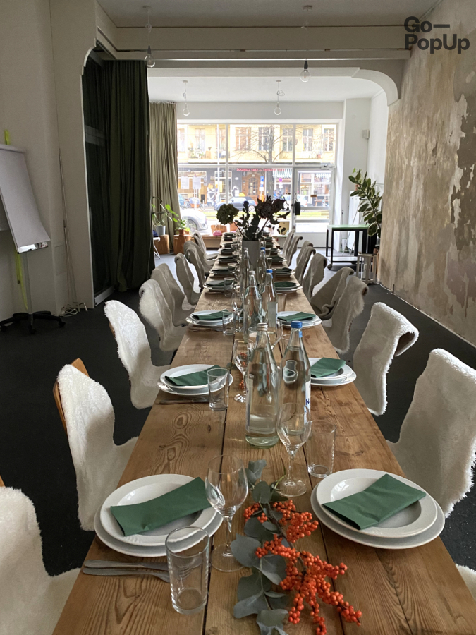 Located in the heart of the city, this is the perfect place to host company dinners, events, talks or pop-up shops in Berlin. It has a very large shop window that works great if you want to host a pop-up experience. Sunny all day, you can play with modular design, dividing it in two areas if needed. Here, sustainability is everything: almost every element is upcycled, recycled or 2nd hand. Walls in the bathroom and kitchen are painted with clay paint. You can tell it’s a premium space also because of the wide range of amenities it offers, from meditation cushions to a fully equipped kitchen. Check more details here.