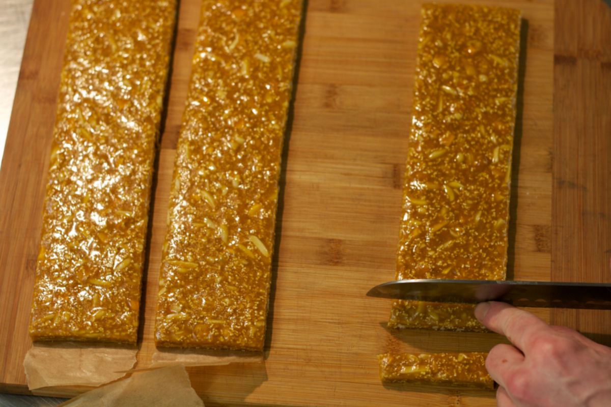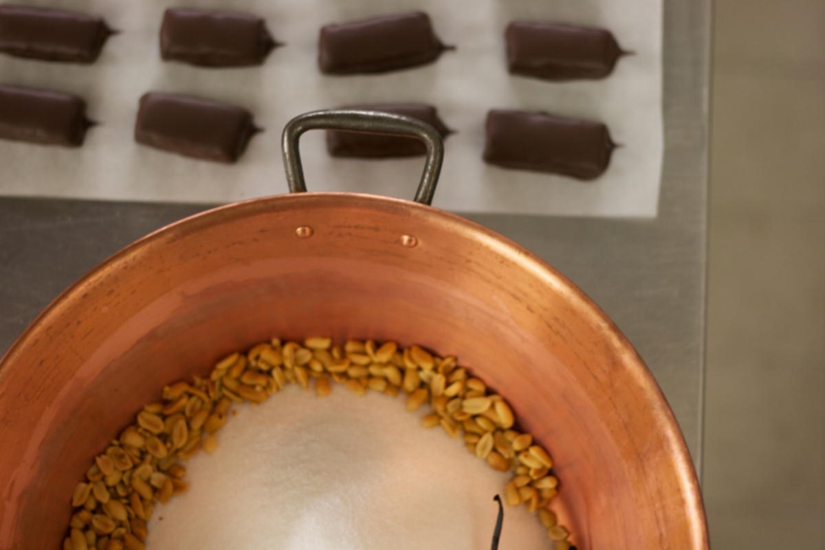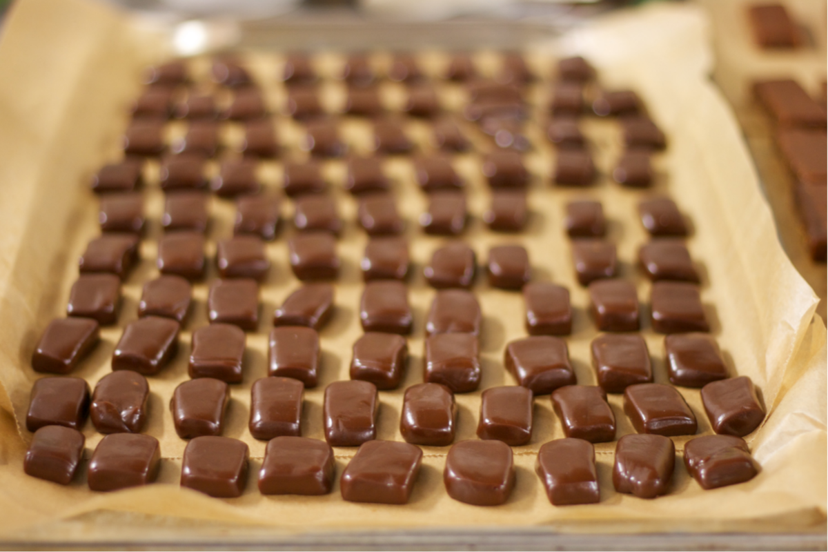 The Candy Kitchen is located admits this musical landscape. It´s more like a laboratory when Reto Brunner and Ulrike Jung are preparing the ingredients for the preparation of Caramelfillings, the first pots are boiling and the smell of real vanilla is in the air .Candyframes are ready to fill with the caramel. In the background hums the small coating machine which makes sure, that the chocolate, which is enveloping the caramel fillings later, keeps smooth and subble. On another table are lying dried fruits, seeds and cashews ready to be processed into fruit slices, a mini meal that fills empty energystores.