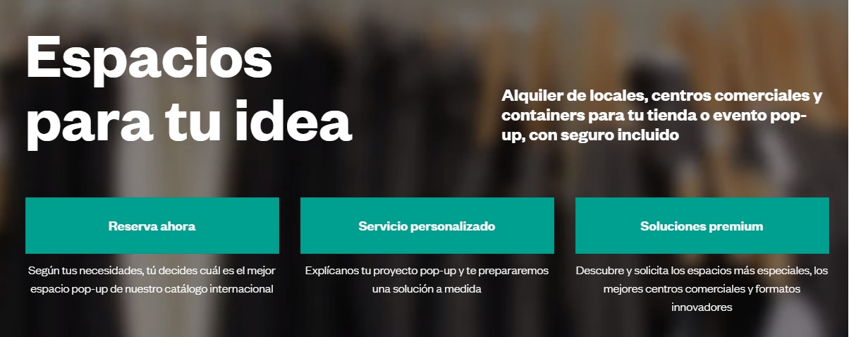 La nueva disposición de la web presenta tres opciones de servicio de manera clara u fácil de elegir. Son servicios que ayudan hacer cualquier idea pop-up posible, sea un showroom, una ubicación estratégica, o un centro comercial. Cualquier idea creativa es posible cuando la mejor ubicación se encuentra y se adapta a las necesidades.