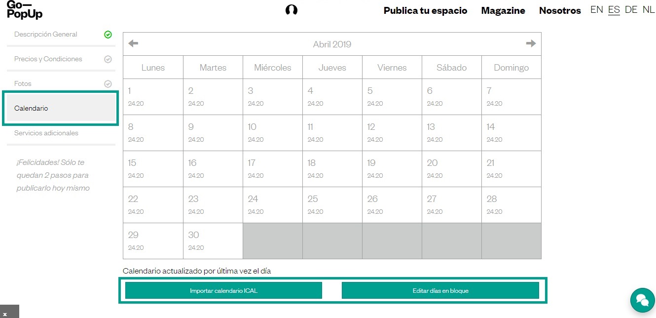 Aprende sobre la variedad de formas en usar y actualizar el calendario para tus espacios publicados en Go—PopUp. El uso de este calendario agiliza tu uso en la plataforma, ya que en ello puedes bloquear fechas en las que el espacio está reservado. De esta forma, tus posibles inquilinos sabrán cuando tu espacio está disponible y procederán con la reserva.
