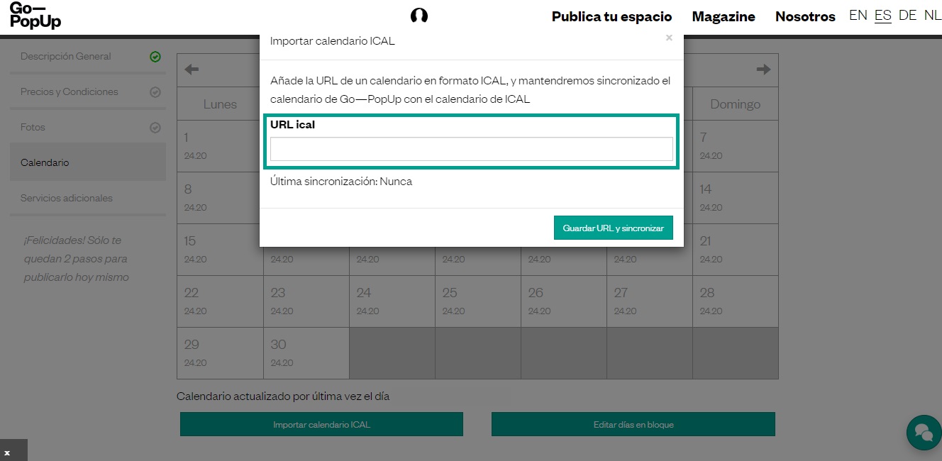 Puedes actualizar el calendario de dos formas: manualmente o sincronizandolo con iCal. Si publicas tu espacio en otros sitios web, puedes sincronizar el calendario de nuestra plataforma con el resto de calendarios que utilices para evitar que se hagan distintas reservas para las mismas fechas.