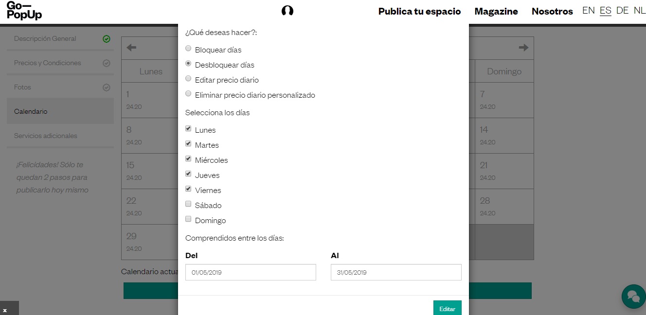 - Selecciona qué acción quieres hacer en el calendario y los días de la semana que serán afectados por este cambio. Por ejemplo: podría ser que tu espacio solo estuviera ocupado entre semana y los fines de semana estuviera libre, en este caso, tendrías que seleccionar los días de lunes a viernes.