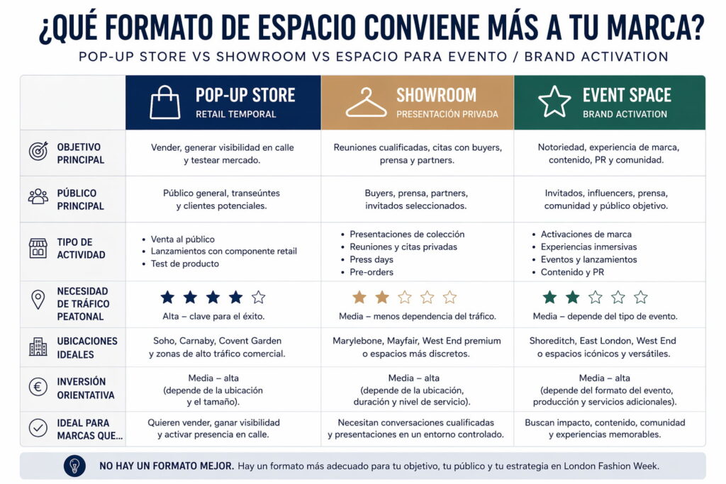 Por eso, para muchas marcas, la pregunta correcta no es “cuánto cuesta un pop-up en Londres”, sino qué tipo de espacio tiene sentido según mi objetivo y qué formato maximiza el retorno durante Fashion Week.