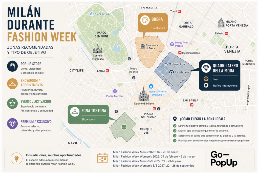 Si buscas Milan Fashion Week 2026, las cuatro ventanas principales a vigilar son enero, febrero, junio y septiembre. Para una marca que valora un pop-up, showroom o activación privada, la cuestión real no es solo cuándo ocurre, sino qué edición encaja mejor con el objetivo y con cuánta antelación conviene decidir ubicación. Según el calendario publicado por Camera Nazionale della Moda Italiana, la edición womenswear Fall/Winter 2026–2027 se celebra del 24 de febrero al 2 de marzo de 2026, mientras que la edición menswear arranca antes en enero.