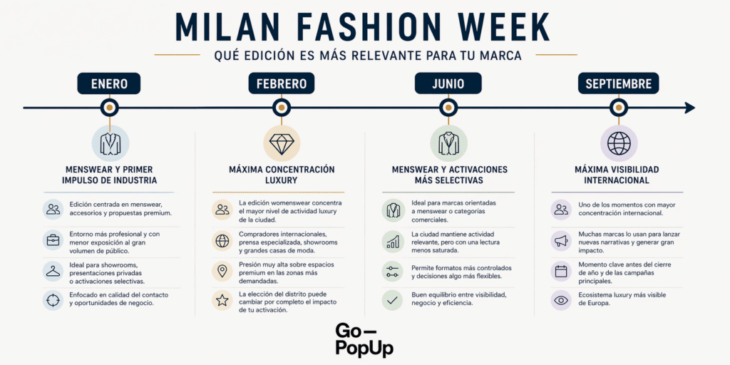 No todas las ediciones de Milan Fashion Week generan el mismo tipo de oportunidad ni responden al mismo objetivo de marca. Aunque el calendario oficial marca cuatro momentos clave al año, en la práctica cada ventana activa una dinámica distinta en la ciudad: cambia el perfil de asistentes, cambia la presión sobre determinadas zonas y también cambia el tipo de formato que suele funcionar mejor.
